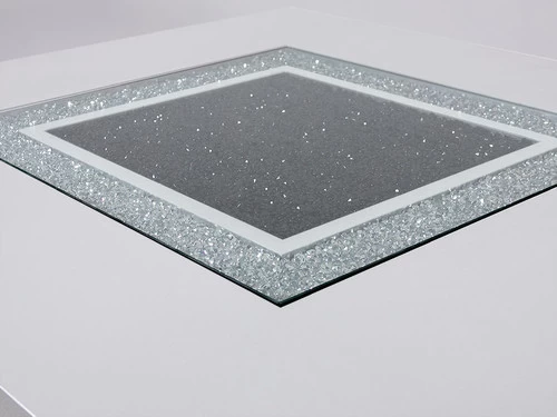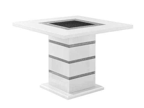 This counter height table is a showcase example of how charm and a touch of elegance can dramatically change the look of your eating area. This table includes glitter detailing style elements with sturdy construction and a high gloss finish with a clear glass inlay to round off the look. Constructed of MDF, Glass, and Acrylic this dining table makes a bold statement. Finished in White with a center glass, rectangle shape, and pedestal base you will have more than enough room to entertain and enjoy your dining experience.