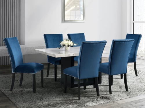 The Valentino Blue Dining 5 Pcs Set will add a bit of glam, to your contemporary space, with the robust and modern silhouette. Entertain your guest around this natural marble top, that beautifully showcases the variations of color. The top is nicely contrasted by the ebony black āUā shaped base, giving your dining space a look of effortless elegance. We love the pairing of a velvet side chair with nail head trimming.