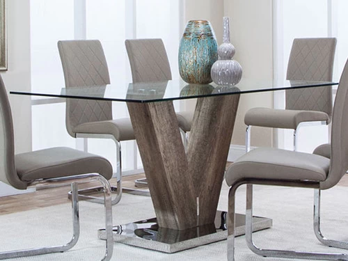 The Veneto dining set is one that will have your guests talking for days. A simple blend of glass, chrome and woodgrain with our unique V shaped base. The glass table provides a spacious open feel in your dining space.