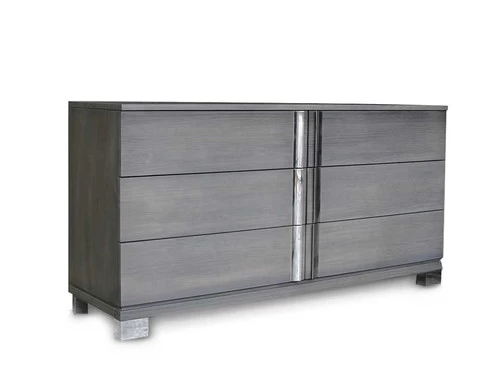 [object Object]Venezia dresser is another creative modern design combination. Grey wood elegant finish case goods accented by silver steel accents.