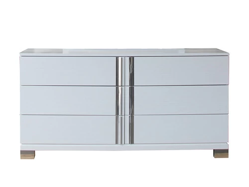 [object Object]Venezia dresser is another creative modern design combination. White wood elegant finish case goods accented by silver steel accents.