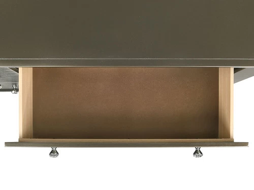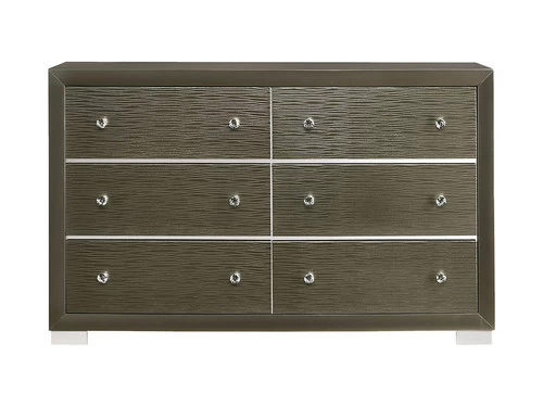 The sophisticated Dresser features a dark champagne finish paired with chrome hardware and feet. The mirror trim detailing adds to the shabby chic look of this bedroom selection. The crystal like knobs on the dresser give this an effortlessly elegant look.