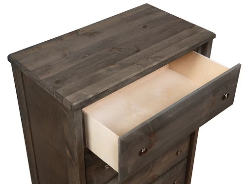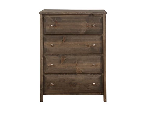 As part of the rustic Wrangle Hill collection, this chest is an integral part of any youth bedroom collection. It has four roomy drawers with center metal glides for ample storage of everything from clothes to blankets. Sturdy construction includes four wide, slightly tapered legs that stands up to daily use. Finished in gun smoke for an understated touch.